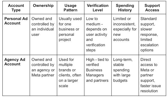 Agency ad accounts are fundamentally different from personal accounts in structure, capacity, and platform treatment. These differences translate to practical advantages: higher spending limits, faster testing, better stability, and operational capabilities that personal accounts can't match.