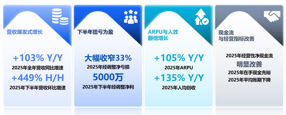 Currently, the Company’s product portfolio and solutions feature more than 300 functional modules, covering a full spectrum of scenarios from data infrastructure to upper-layer analytics applications. In 2025, its active paid clients base reached 230, with an outstanding customer retention rate of 90%. ARPU increased substantially from RMB 2.72 million in 2024 to RMB 5.59 million in 2025, representing a year-on-year growth of over 103%.
