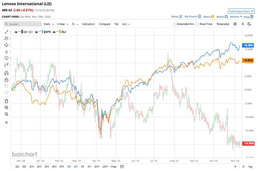 Shares of Lennox International have underperformed the broader market. Over the past 52 weeks, LII has declined 22.4%, while the broader S&P 500 Index ($SPX) has rallied nearly 14% over the same time frame. In 2025, LII stock is down 19.7%, compared to the SPX’s 16.2% rise on a YTD basis.