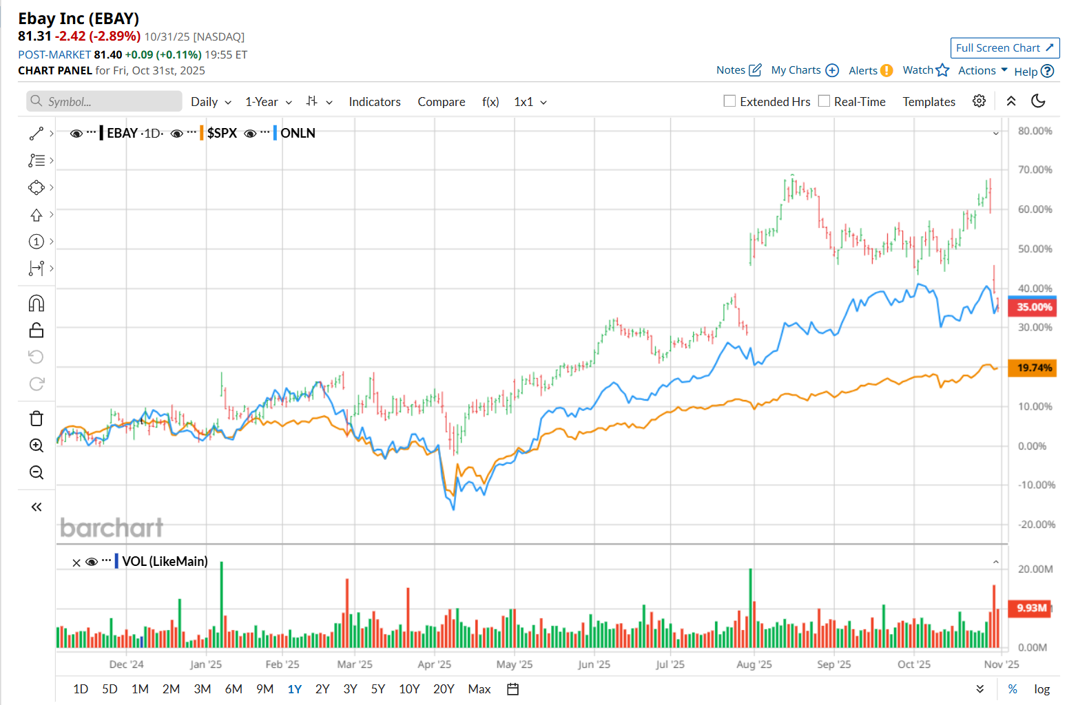 EBAY delivered better-than-expected Q3 earnings results on Oct. 29. Overall, the company’s revenue improved 9.5% year-over-year to $2.8 billion, surpassing consensus estimates by 2.9%. Moreover, its adjusted EPS of $1.36 increased 14.3% from the year-ago quarter, topping analyst expectations by 2.3%. However, despite these positives, its shares crashed 15.9% in the following trading session as investors focused on its weaker-than-expected Q4 profit outlook, fueling concerns amid persistent macroeconomic uncertainty. Additionally, EBAY’s total number of active buyers remained flat year over year, underscoring its continued struggle to attract new users.