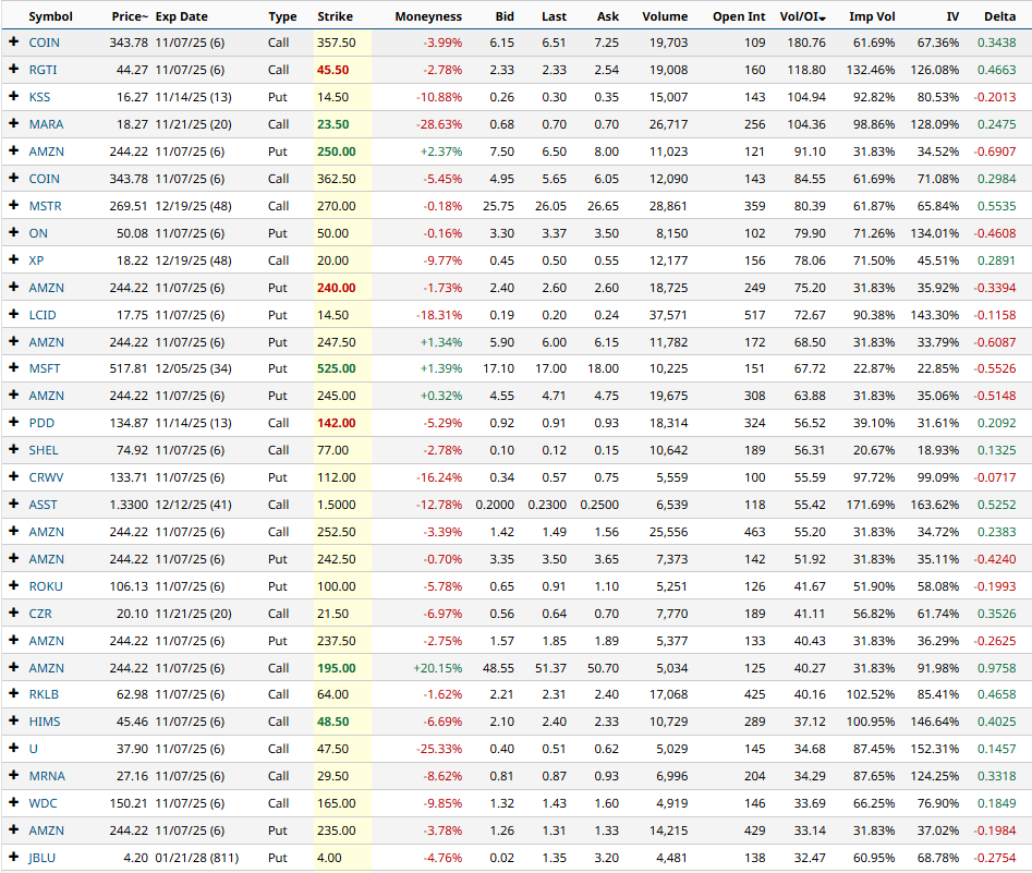 COIN, RGTI, MARA, AMZN, MSTR, MSFT and CRWV all experienced unusual options activity last week.