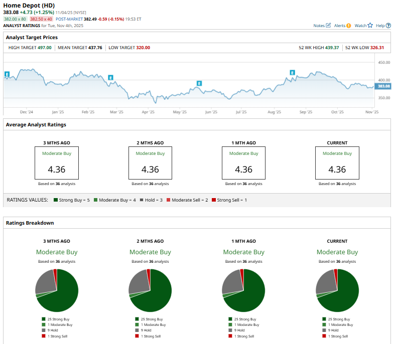 The mean price target of $437.76 represents a 14.3% premium from HD’s current price levels, while the Street-high price target of $497 suggests an upside potential of 29.7%.