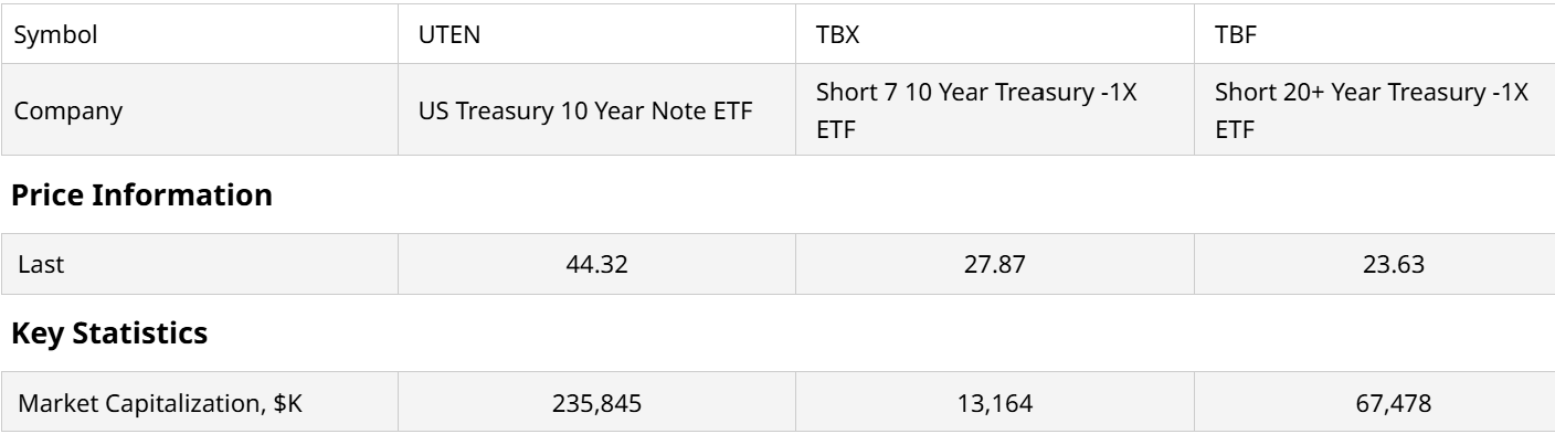That’s the $235 million US Treasury 10 Year Note ETF (UTEN) which debuted just over three years ago. To try to profit from rising rates, there are a pair. Pro Shares Short 7-10 Year Treasury -1X ETF (TBX) is the better fit in terms of maturity years and volatility. However it is a very small ETF, versus the Pro Shares Short 20+ Year Treasury -1X ETF (TBF), which itself is not very large. Still, these have been around a long time, so they are tested. Just not popular.