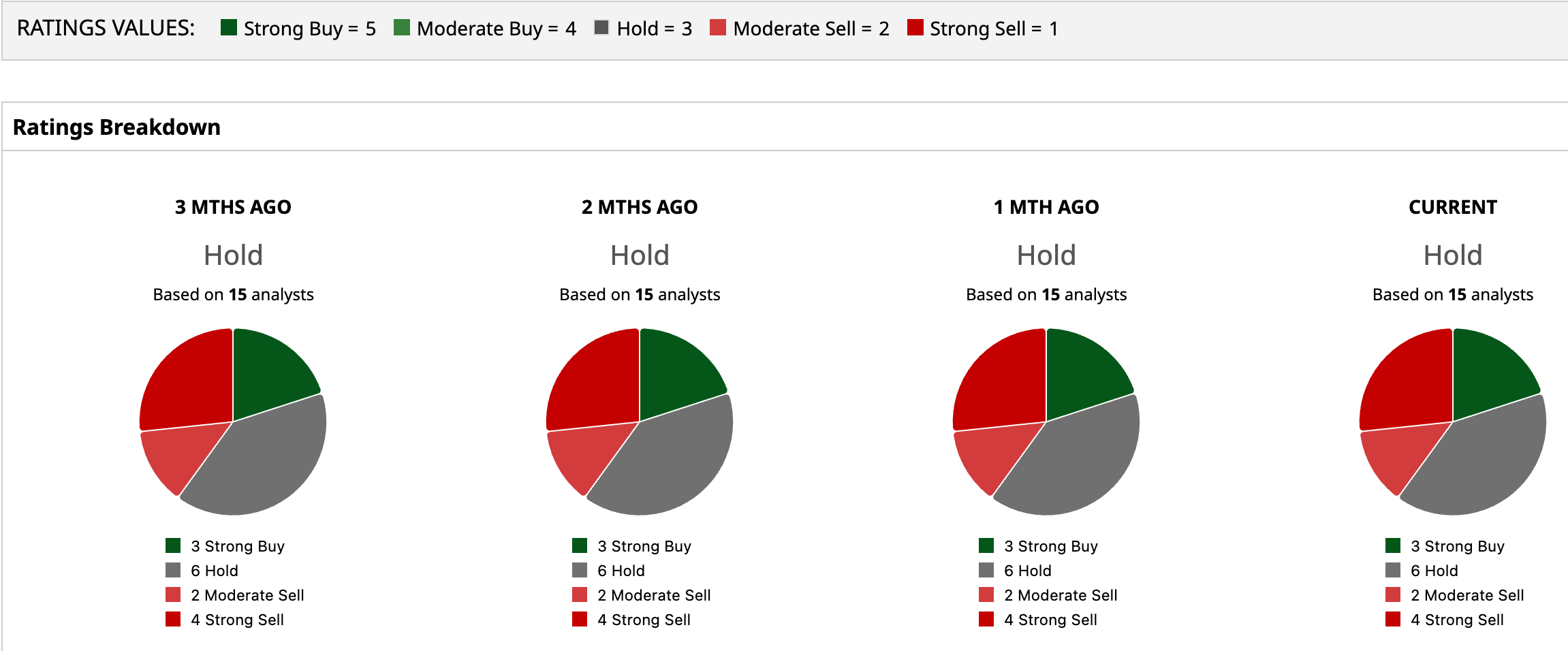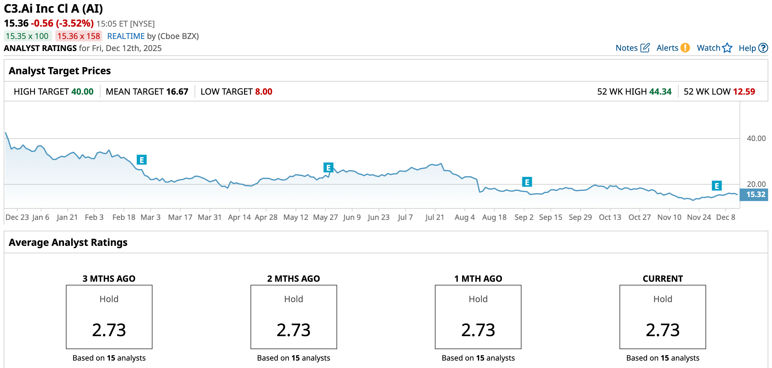 Analysts are playing it safe with C3.ai, giving a consensus rating of “Hold.” Out of 15 analysts covering the stock, just three suggest a “Strong Buy,” six recommend a “Hold,” two advise a “Moderate Sell,” and the remaining four analysts are outright skeptical, giving a “Strong Sell” rating.