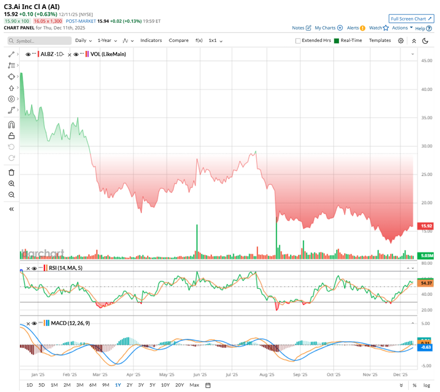 Over the past month, C3.ai has finally shown a flicker of momentum. The 14-day RSI has climbed steadily to 50.29 from November’s oversold depths, signaling renewed buying interest, although the stock is still down 65.46% from last year’s $44.34 peak. The MACD oscillator is echoing that shift in tone. The yellow line has crossed above the blue signal line, and the histogram has turned positive, hinting that bearish pressure is easing and short-term momentum is swinging back in the bulls’ favor.