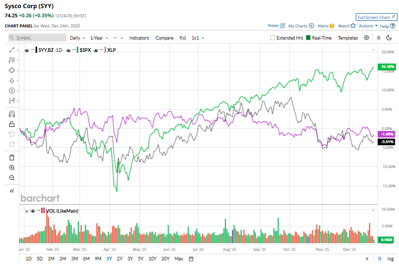 SYY stock has plummeted 4.2% over the past year, trailing the S&P 500 Index’s ($SPX) 14.8% gains and the Consumer Staples Select Sector SPDR Fund’s (XLP) 1.7% losses over the same time frame.