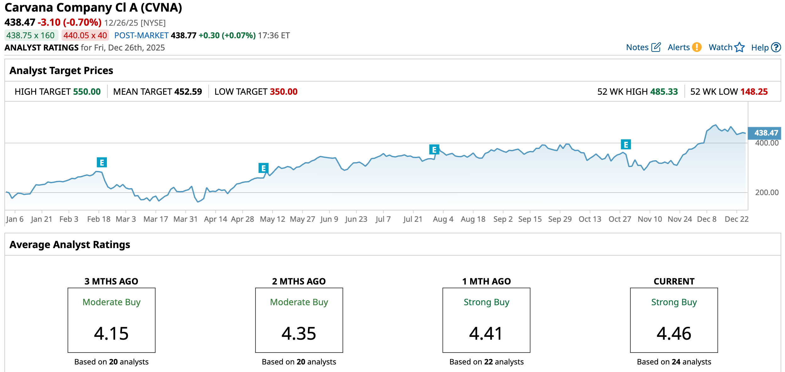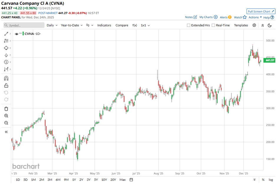 Over the past year, Carvana’s shares have rallied roughly 95.7%, with year-to-date (YTD) gains of 115.6%, closing the last session at $438.47. This remarkable run has been fueled by improving fundamentals, record vehicle sales, expanding profitability, and renewed investor confidence as the company moved back into growth mode after years of volatility.