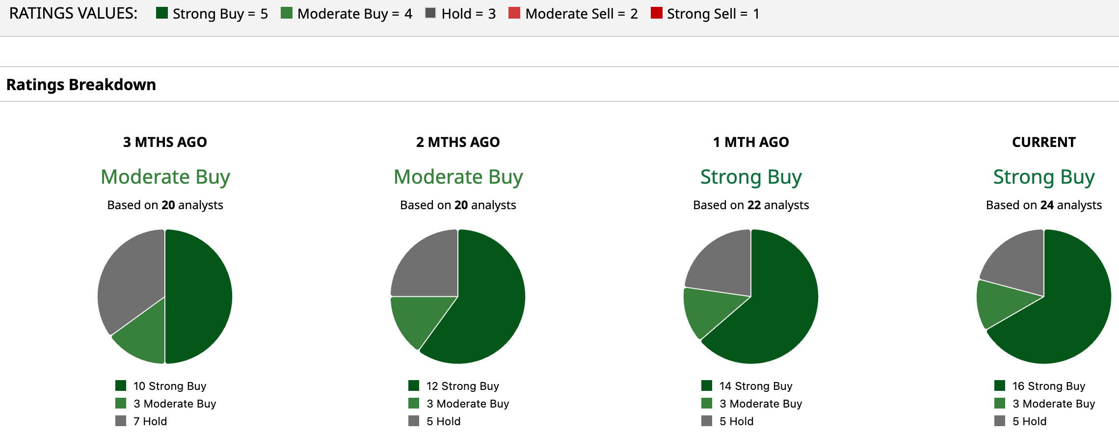 CVNA has a consensus rating of a “Strong Buy” overall. Of the 24 analysts covering the stock, 16 advise a “Strong Buy,” three suggest a “Moderate Buy,” and five analysts give it a “Hold” rating.