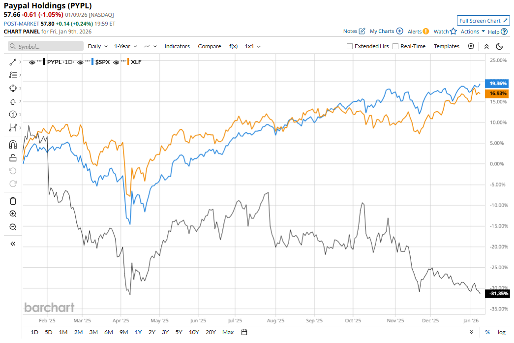 PayPal’s stock has been sliding over the past year largely because of investors’ concerns about slowing growth and increasing competitive pressure in the digital-payments space. In the last reported quarter (Q3 2025), active accounts grew only about 1% year-over-year, while total payment transactions declined 5%, and transactions per active account on a trailing 12-month basis fell 6%, indicating users are transacting less frequently. Also, macroeconomic headwinds like softer consumer spending and tariff-related uncertainties have further weighed on sentiment.