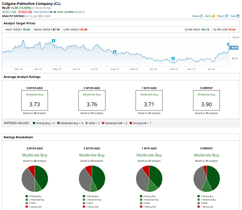 The stock holds a consensus “Moderate Buy” rating overall. Of the 21 analysts covering the CL stock, opinions include nine “Strong Buys,” three “Moderate Buys,” eight “Holds,” and one “Strong Sell.”