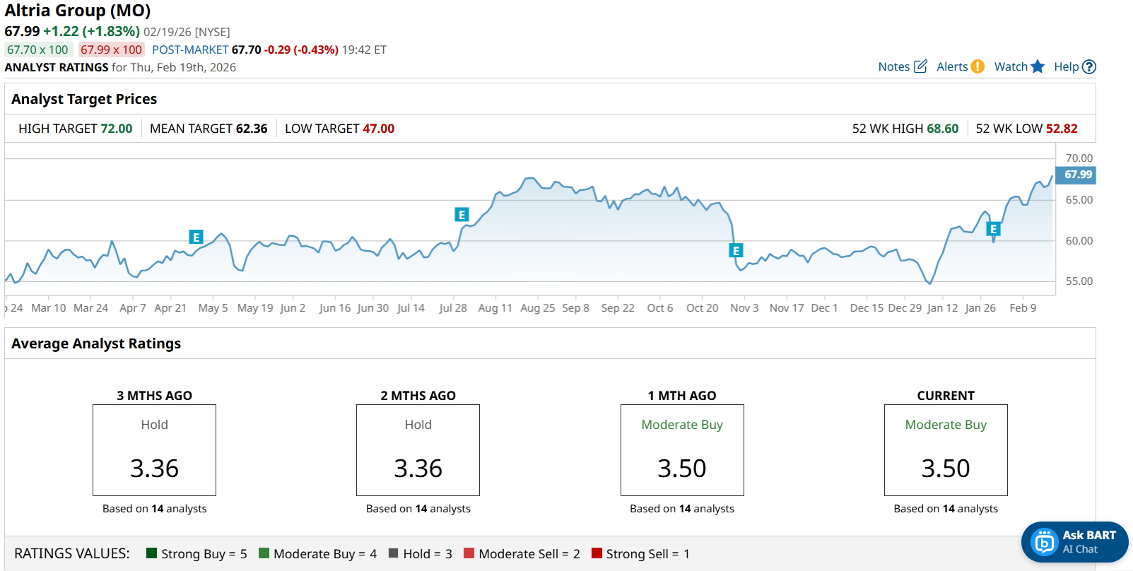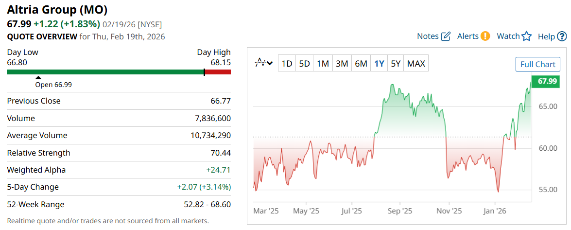Altria stock trades at approximately $68. It is up roughly 18% year-to-date and about 53% over the last 5 years. It may not be the highest-performing stock, but it has outperformed the S&P 500, which has been rather flat over the same period. That said, Altria's yield tells a very different story.