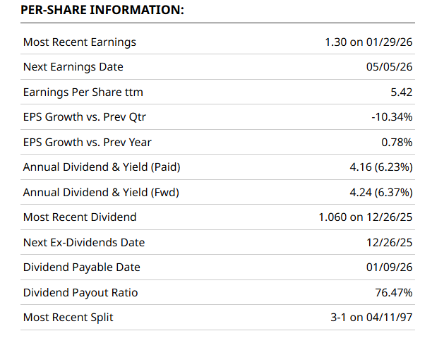 All this resulted in an (non-GAAP) adjusted EPS of $1.30, which covers its $1.06 quarterly dividend payout. However, the company’s dividend payout ratio is at 76%. For reference, this is the part of the company’s income that it uses to pay dividends.