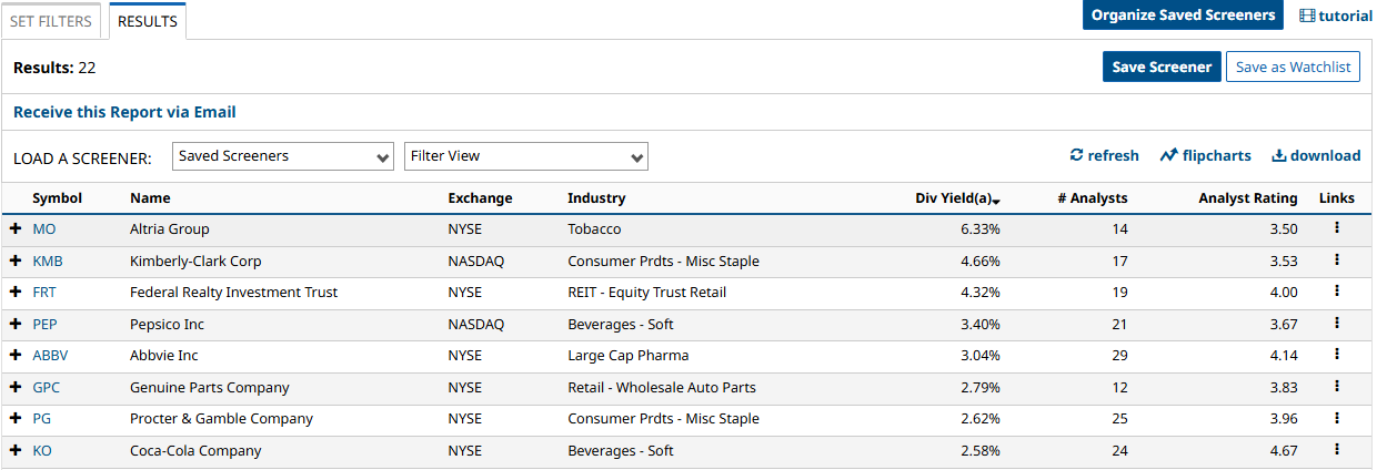 Using Barchart’s Stock Screener, I selected the following filters to get my list: