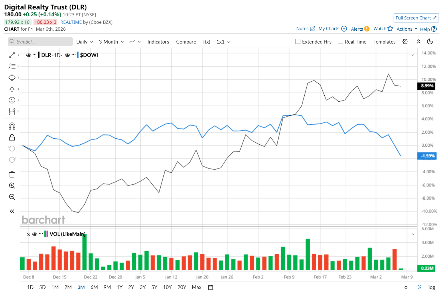 This REIT is currently trading 2% below its 52-week high of $184.79, reached on Feb. 12. Shares of DLR have rallied 9.9% over the past three months, outpacing the Dow Jones Industrial Average’s ($DOWI) 1.9% drop during the same time frame.