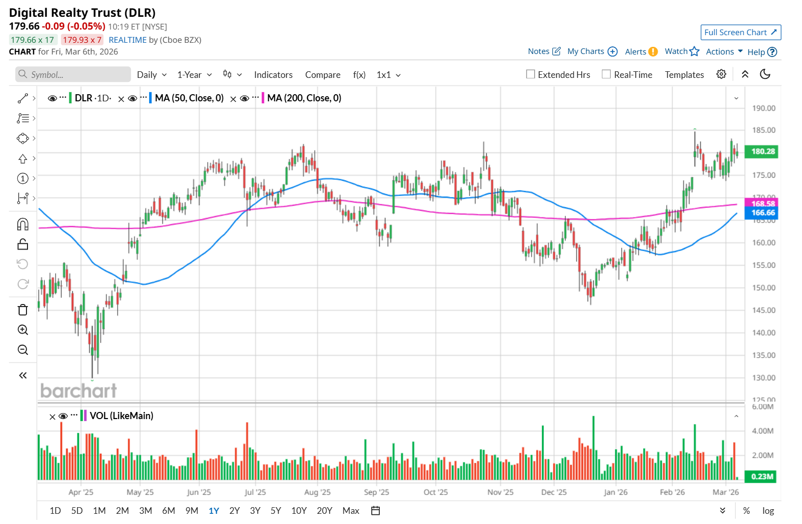 Dallas, Texas-based Digital Realty Trust, Inc. (DLR) is a real estate investment trust (REIT) that owns, operates, and develops a vast portfolio of data centers. Valued at a market cap of $61.8 billion, the company supports mission-critical infrastructure for over 5,000 customers, including hyperscale cloud providers, financial institutions, and global enterprises.