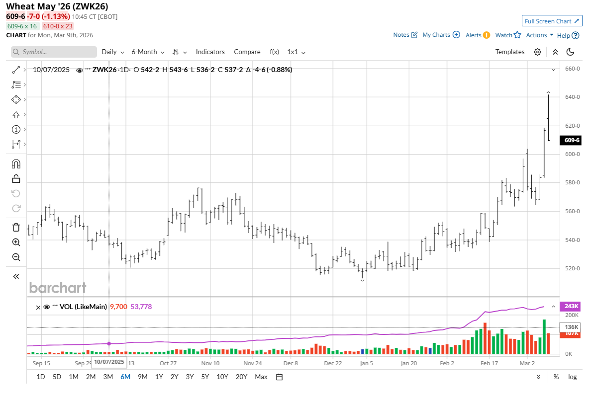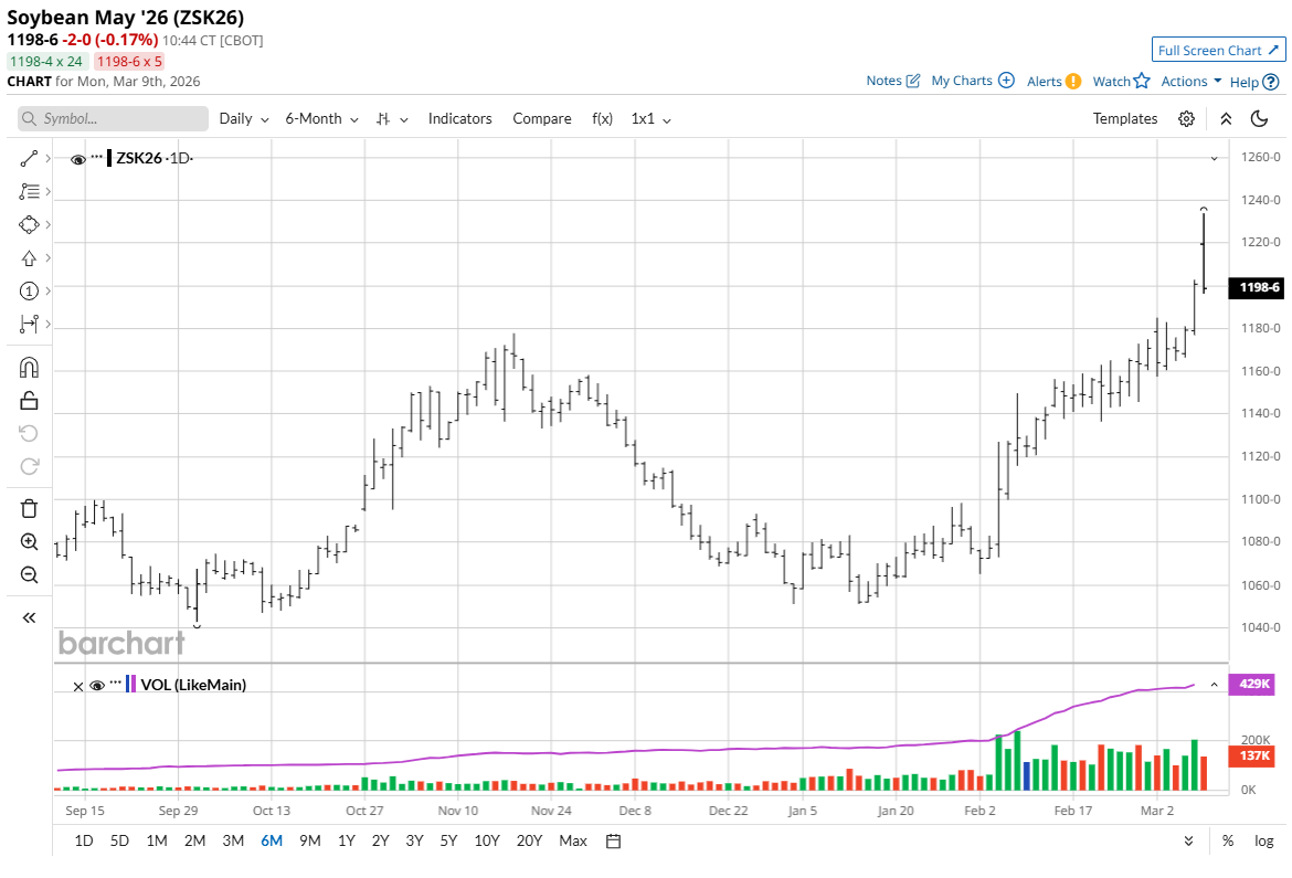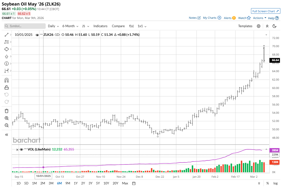 Soybean oil’s (ZLK26) surge is helping lead soybeans higher as refiners look to lock in supplies following the Environmental Protection Agency’s 2026 biomass-biodiesel mandate and amid surging crude oil. However, soybean oil’s bull run could end abruptly if crude oil prices start to back off on notions oil flows out of the Middle East will return to normal.