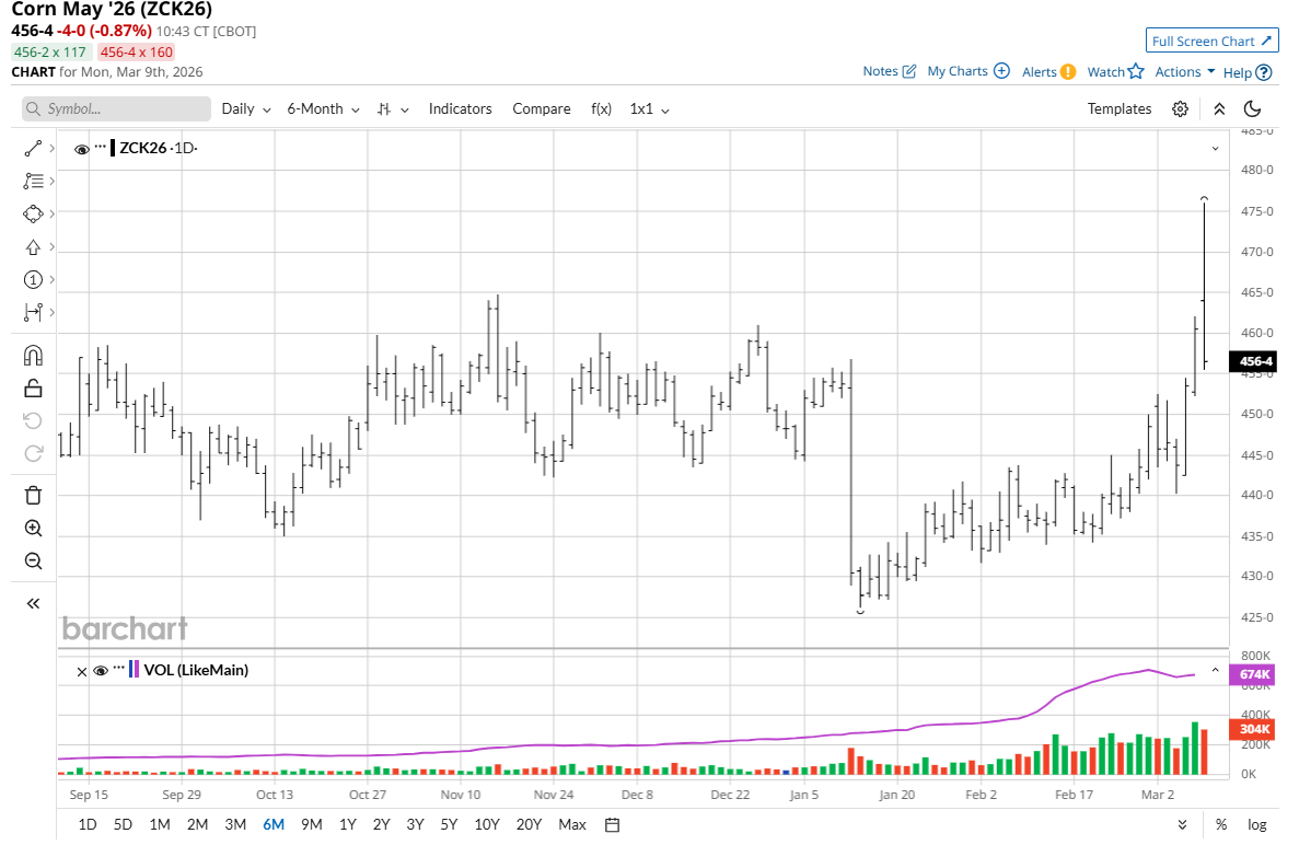 May corn (ZCK26) futures on Friday rose 7 cents to $4.60 1/2, hit a nearly four-month high, and for the week were up 12 cents. May soybean (ZSK26) futures rose 21 1/2 cents to $12.00 3/4, hit a two-year high, and for the week rose 30 cents. May soft red winter wheat (ZWK26) futures on Friday gained 33 cents to $6.16 3/4, hit an eight-month high, and for the week were up 25 1/4 cents. May hard red winter wheat (KEK26) rose 31 cents to $6.23 1/2, hit a nine-month high, and on the week were up 43 cents.