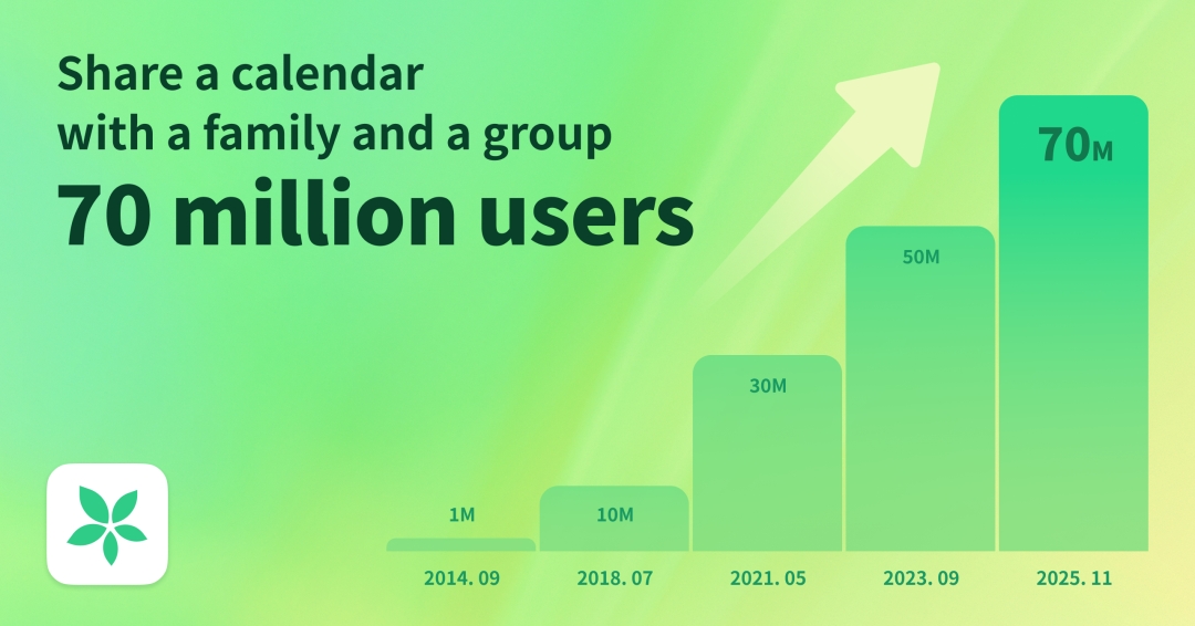The calendar sharing app 'TimeTree' is a calendar service premised on sharing and communication. It allows easy schedule sharing among multiple people—families, partners, clubs, workplaces, and more—and enables users to create multiple calendars tailored to different purposes. Since beginning service on March 24, 2015, it has surpassed 67 million registered users worldwide as of August 2024. It is widely used in users' daily lives as a "wall calendar inside your smartphone."