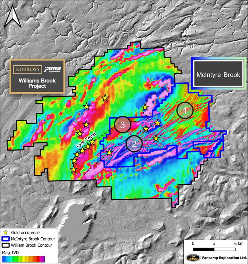 The results of the ongoing exploration program, centered on the 3 principal showings identified at McIntyre Brook (Figure 1), incorporating a comprehensive review of historical data and recent exploration work (refer to press releases dated March 3, 2025, January 20, 2025, and January 20, 2025), confirm the prospectivity for gold mineralization of the (1) Electromagnetic Anomaly ("EM") Zone, (2) McIntyre Brook Prospect and (3) the Northwest Area. The Northwest Area of McIntyre Brook is an area of substantial interest as it lies on strike with Puma Exploration's Williams Brook Lynx showing which reported high-grade drill results including 5.50 g/t Au over 50 metres (refer to hole WB21-02 from Puma Exploration press release dated September 15, 2021). Previous notable findings from the exploration program at McIntyre Brook, including results of trenching and chip channel sampling, confirmed a gold bearing rhyolitic horizon with a strike extension of at least 200-metres with up to 9-metres of thickness, significantly increasing the known surface expression of mineralization identified by historical drilling (refer to press release dated January 20, 2025).