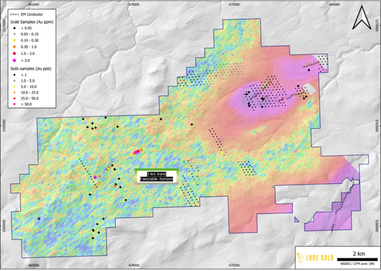 "The latest results from McIntyre Brook confirm the exceptional potential of the New Brunswick joint venture will provide quality, high priority targets for systematic drill testing," stated Lode Gold Director, Jon Hill. "The combination of high-grade assays from grab and chip samples, coincident gold-in-soil anomalies, and strong electromagnetic conductors along a 3-kilometre strike length all point to the discovery potential for a robust mineralized system within this rapidly emerging belt."