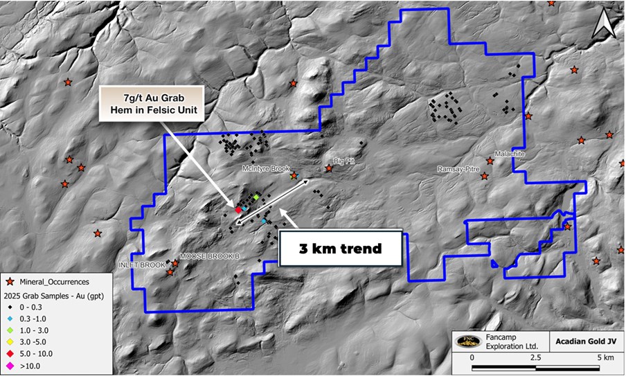 A prospecting and trenching program conducted in May-June of 2025, followed by a soil geochemical survey in July 2025, resulted in the discovery of high-grade rock grab samples extending the known favorable horizon of Area 2 (McIntyre Brook Prospect) to a minimum strike extension of 3 km (Figure 1).
