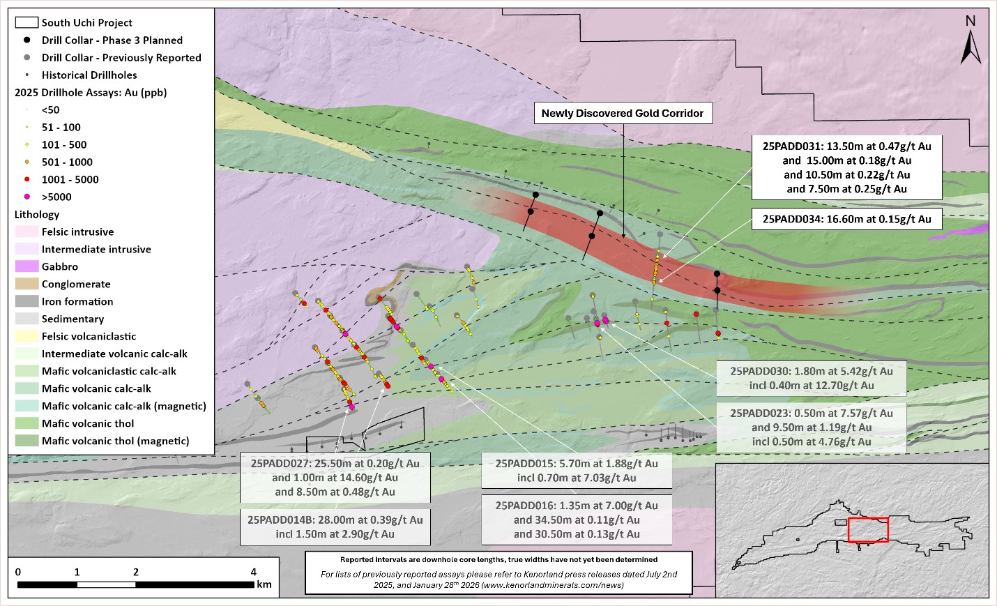 Vancouver, British Columbia--(Newsfile Corp. - April 1, 2026) - Kenorland Minerals Ltd. (TSXV: KLD) (OTCQX: KLDCF) (FSE: 3WQ0) ("Kenorland" or the "Company") is pleased to announce commencement of the Phase 3 diamond drill program at the South Uchi Project (the "Project"), located in the Red Lake District of Ontario and held under an option agreement with Auranova Resources Inc. ("Auranova").