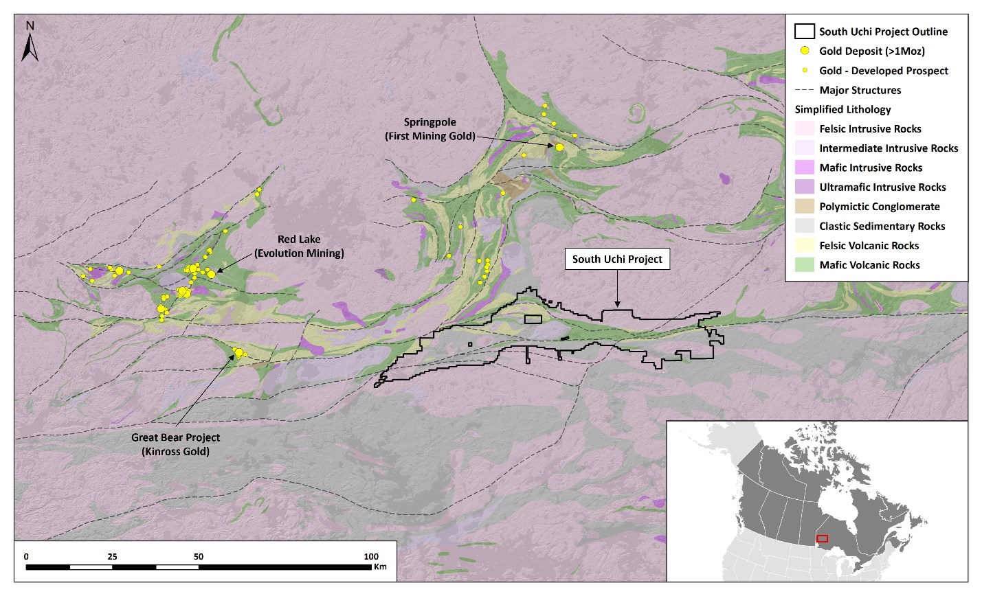 Figure 2. Regional geology with significant gold deposits and South Uchi Project location