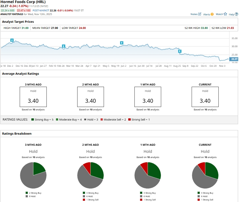 On Nov. 6, Piper Sandler analyst Michael Lavery maintained a “Neutral” rating on HRL, but notched down the price target from $26 to $25.