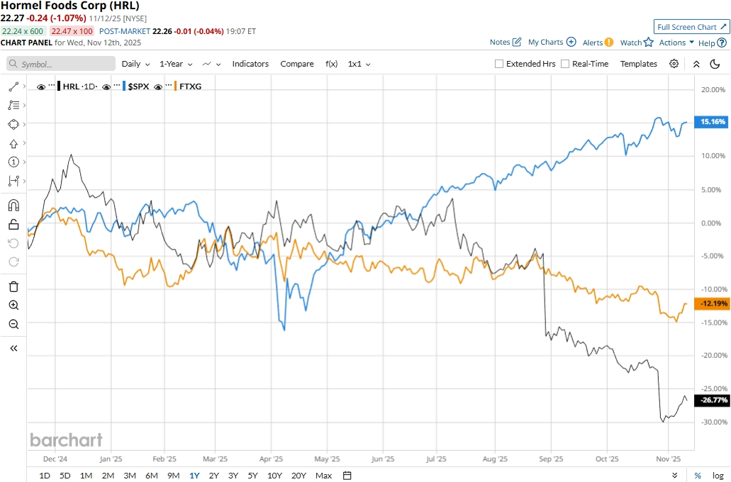 The packaged foods major has substantially underperformed the broader market over the past year. Hormel Foods' stock prices have plummeted 29% on a YTD basis and 26.7% over the past 52 weeks, compared to the S&P 500 Index’s ($SPX) 16.5% gains in 2025 and 14.5% returns over the past year.