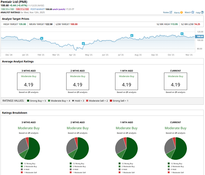 Among the 21 analysts covering the PNR stock, the consensus rating is a “Moderate Buy.” That’s based on 12 “Strong Buys,” two “Moderate Buys,” six “Holds,” and one “Moderate Sell.”