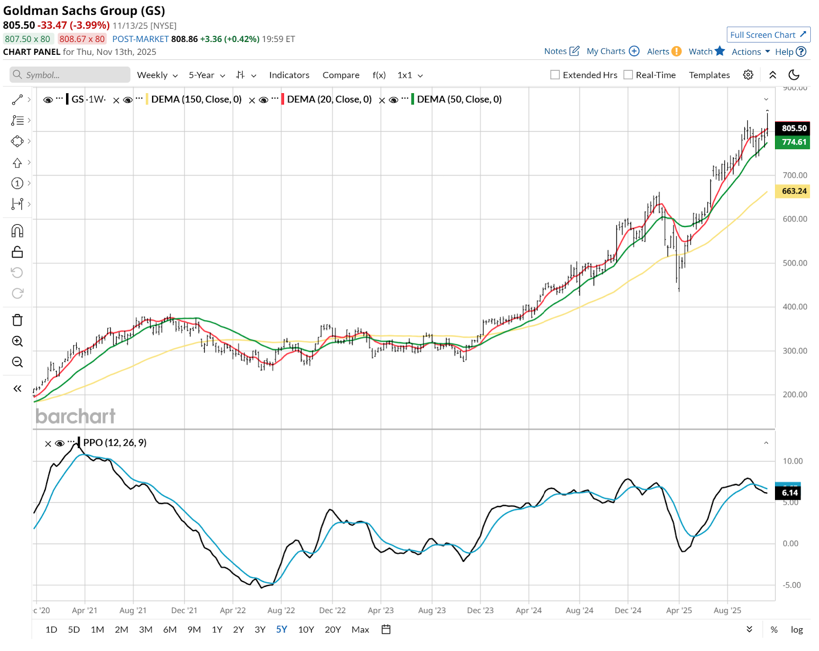 For instance, here’s Goldman Sachs (GS). It is now the Dow’s biggest holding at more than 10%. And while its stock price has not caved in, and potential for lower short-term interest rates could be a boost to financial stocks, this tree has grown quite high.