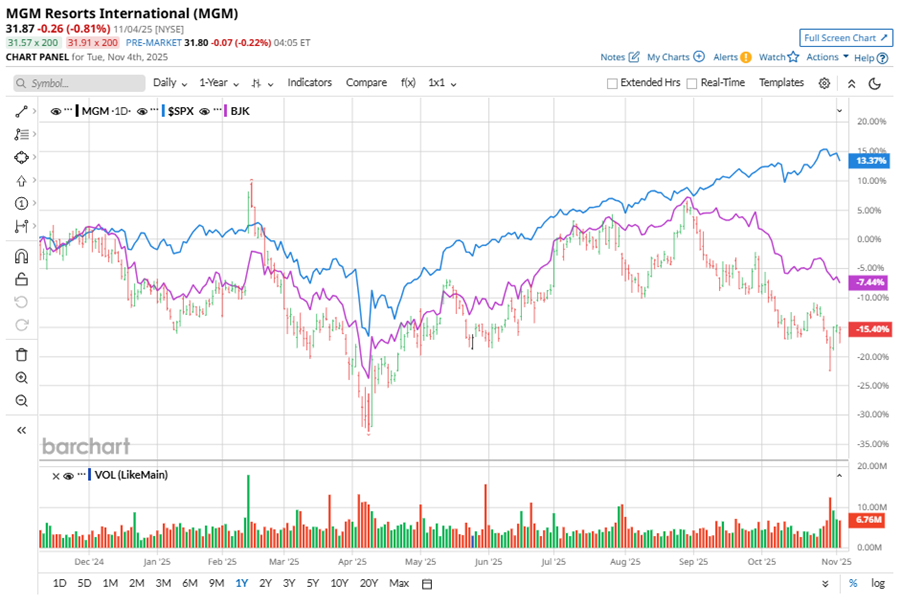 Shares of this global hospitality and entertainment giant have notably underperformed the broader market over the past year. MGM has declined 12.5% over this time frame, while the broader S&P 500 Index ($SPX) has rallied nearly 18.5%. In 2025, MGM stock is down 8%, compared to the SPX’s 15.1% rise on a YTD basis.