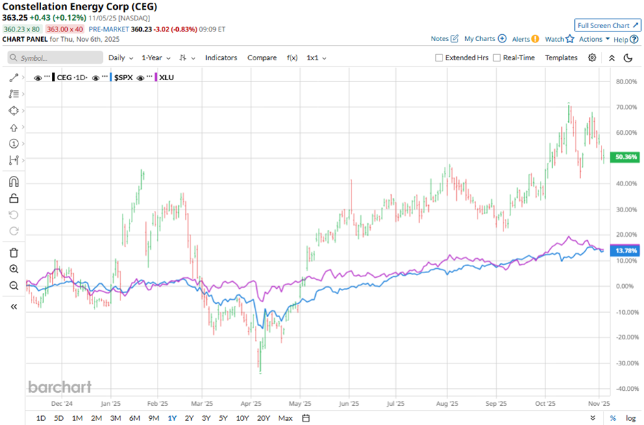 Shares of the Baltimore, Maryland-based company have significantly surpassed the broader market over the past 52 weeks. CEG stock has surged 53.6% over this time frame, while the broader S&P 500 Index ($SPX) has rallied 17.5%. In addition, shares of CEG are up 61.4% on a YTD basis, compared to SPX's 15.6% gain.