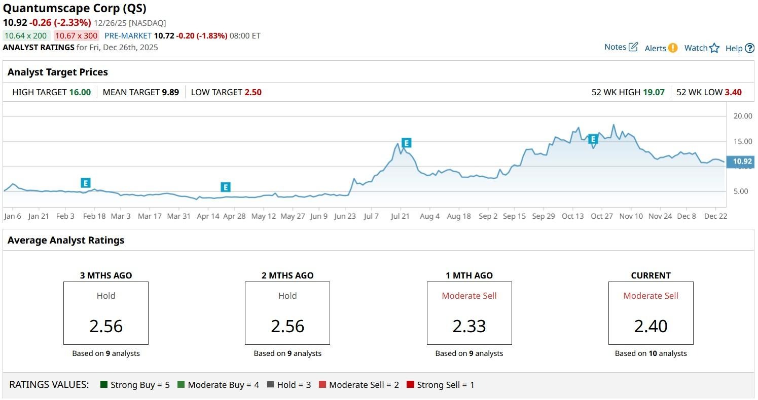 The consensus rating on QuantumScape stock currently sits at “Moderate Sell” with the mean target $9.89 indicating potential downside of about 10% from here.