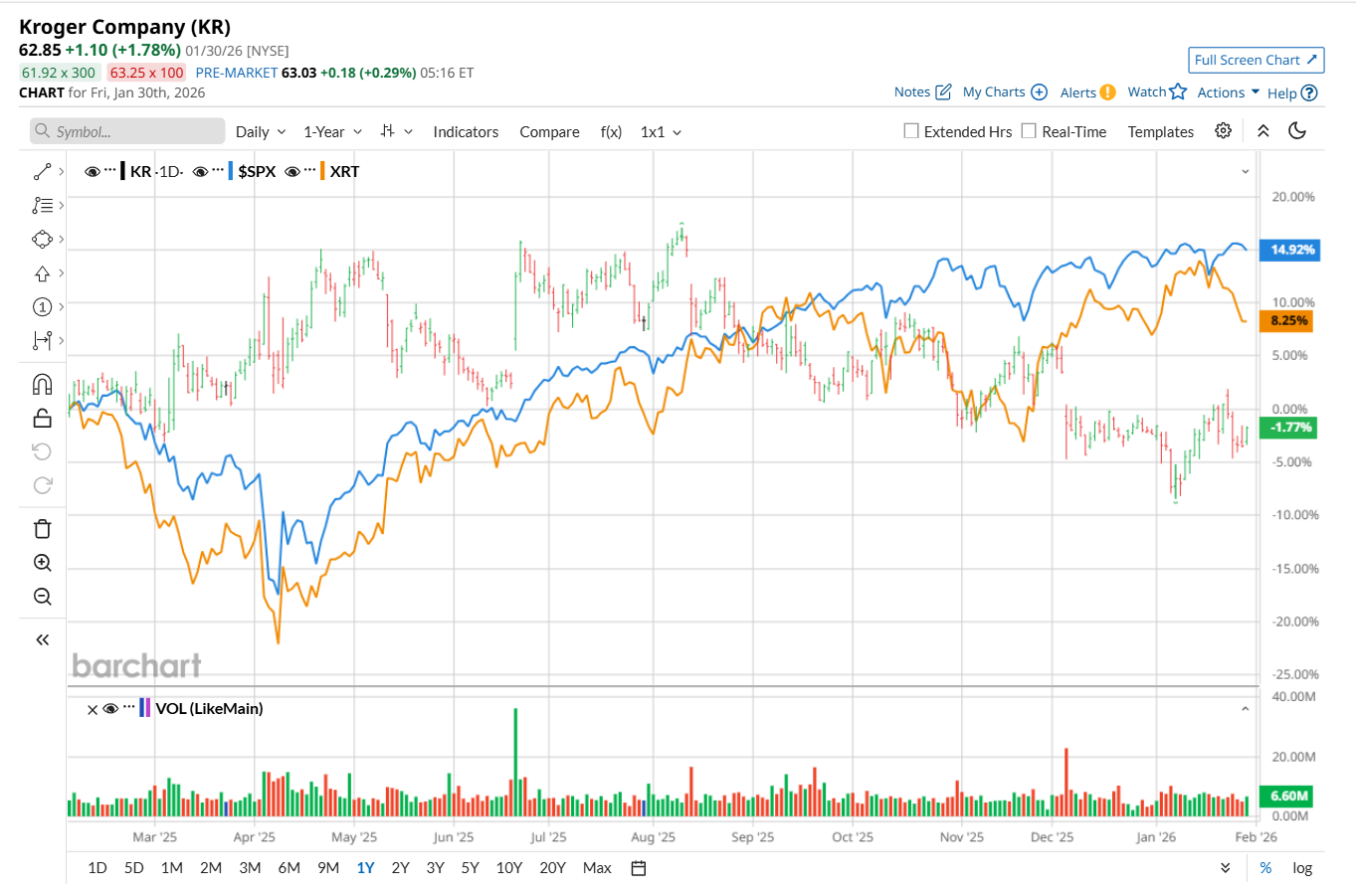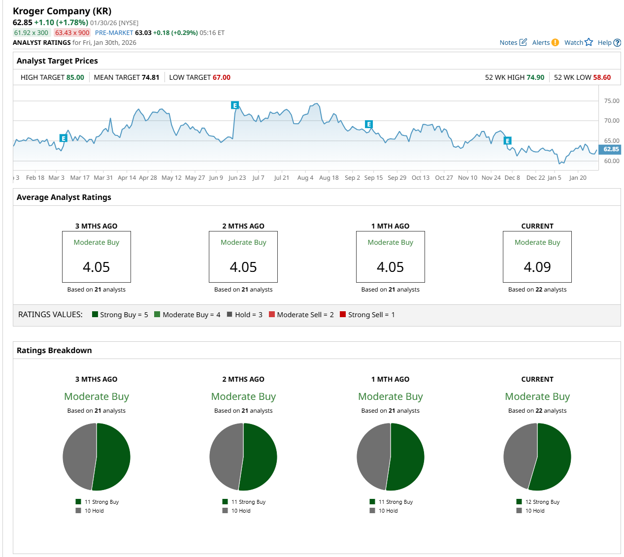 On Jan. 15, Morgan Stanley (MS) maintained an "Equal Weight" rating on KR but lowered its price target to $67, indicating a 6.6% potential upside from the current price levels.