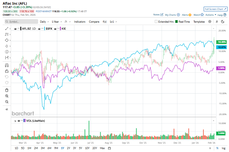 However, zooming in further, AFL has outpaced the SPDR S&P Insurance ETF’s (KIE) 1.8% uptick over the past 52 weeks and 1.7% YTD decline.