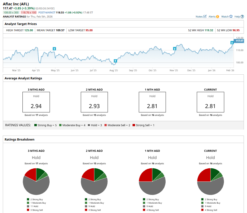 On Feb. 4, Aflac Incorporated reported its Q4 2025 results, sending shares up 1.4%. Total revenue declined 9.3% year over year to $4.9 billion. Its adjusted earnings decreased 5.4% to $818 million, though adjusted EPS rose marginally to $1.57. Net investment gains dropped 46.3% year over year to $537 million from $1 billion, reflecting weaker derivatives, currency, and securities performance. Shareholders’ equity strengthened to $29.5 billion, or $56.85 per share, up from $26.1 billion a year earlier, and the company generated a strong annualized return on equity of 19%, highlighting solid capital strength despite softer earnings.