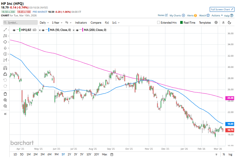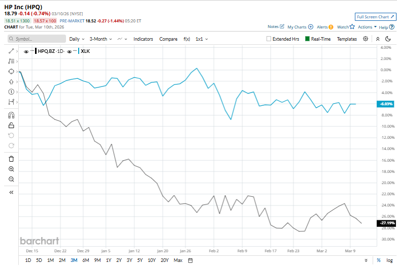 However, HPQ has faced challenges and has slipped 37.1% from its 52-week high of $29.89. Over the past three months, HPQ stock has declined 26.3%, underperforming the State Street Technology Select Sector SPDR Fund’s (XLK) 6% decline during the same period.