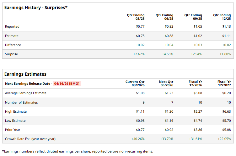 The bank holding company is expected to announce its fiscal first-quarter earnings for 2026, before the market opens on Wednesday, Apr. 16. Ahead of the event, analysts expect CFG to report a profit of $1.08 per share on a diluted basis, up 40.3% from $0.77 per share in the year-ago quarter. The company has consistently surpassed Wall Street’s EPS estimates in its last four quarterly reports.