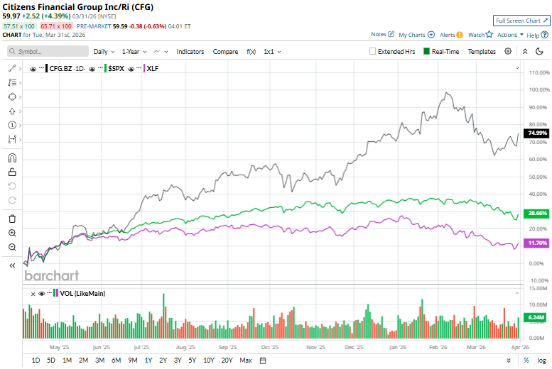 CFG stock has popped 49% over the past year, outperforming the S&P 500 Index’s ($SPX) 17% gains and the State Street Financial Select Sector SPDR Fund’s (XLF) marginal returns over the same time frame.