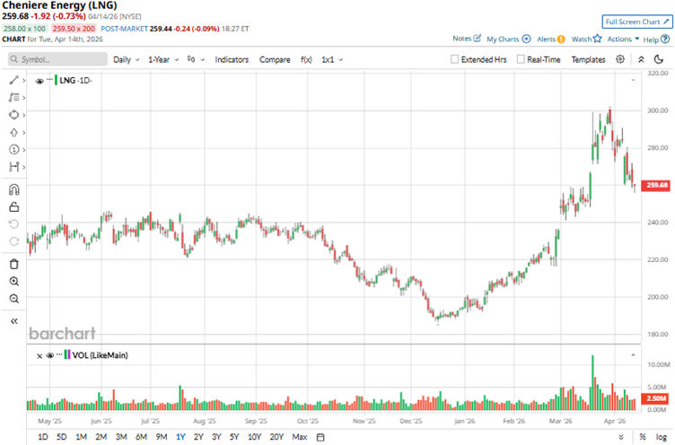Over the past 52 weeks, Cheniere’s stock has gained 13.13%, while it has been up 32.08% year-to-date (YTD). The company’s shares reached a 52-week high of $300.89 on March 30, but are down 14.67% from that level.