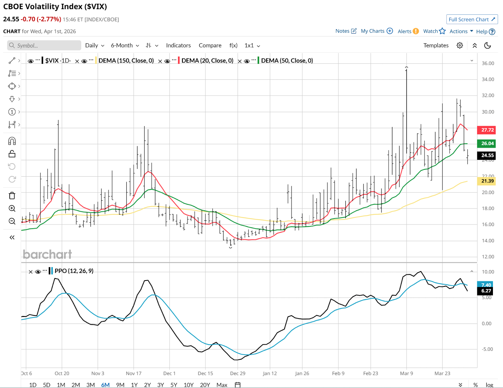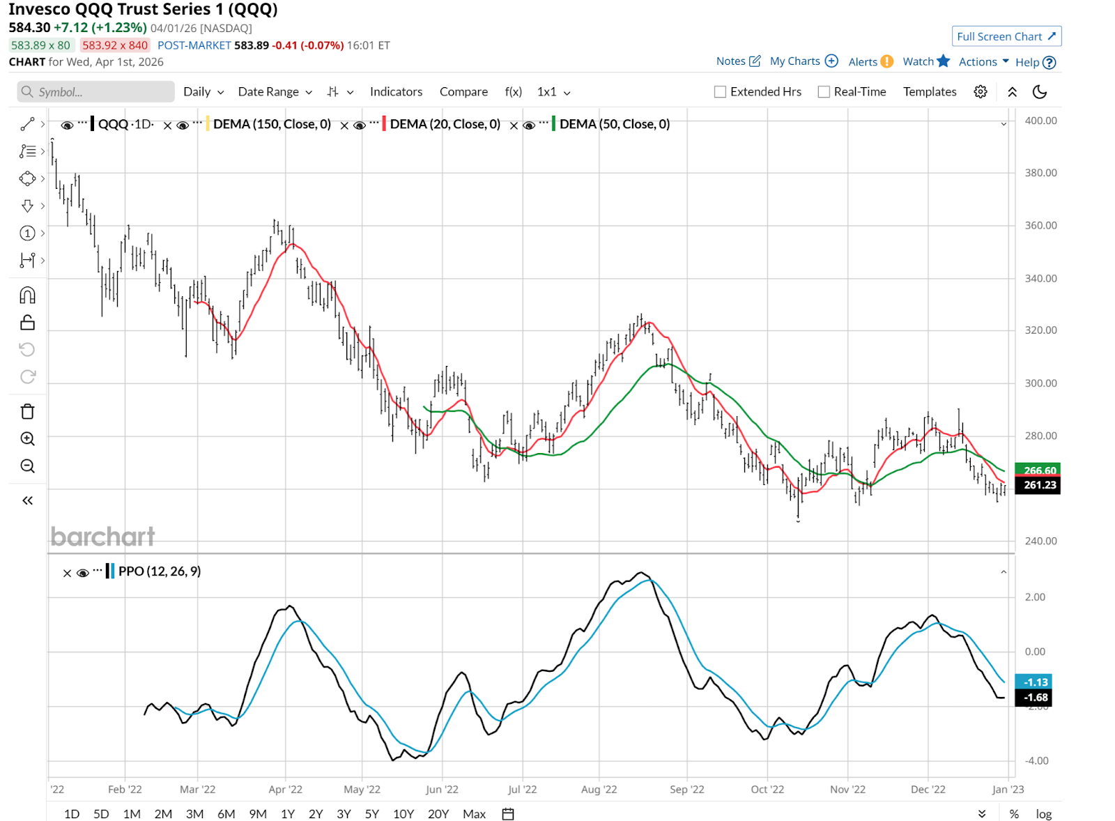 1. QQQ appears to me to be in a VERY precarious position right now. The percentage price oscillator (PPO) is in negative territory, and while the recent pop gives it another life for now, if we break below the recent lows, I think investors should look out below.