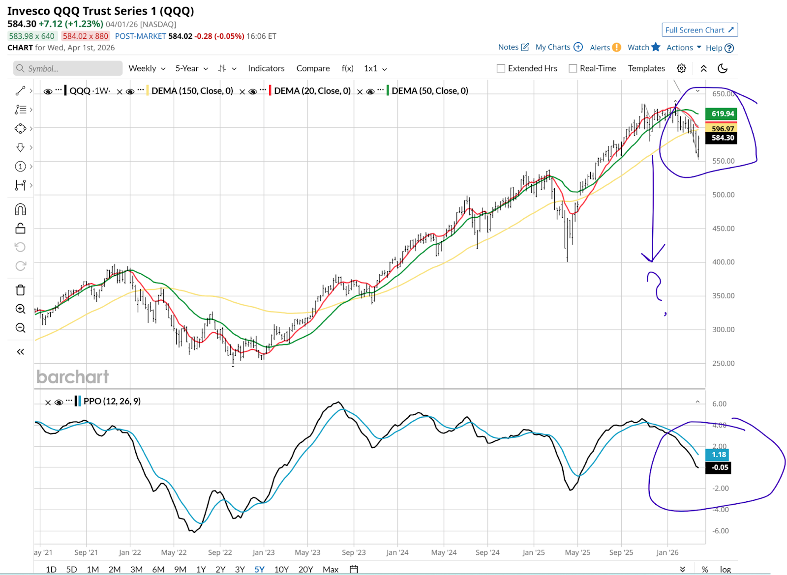 Here’s the current QQQ chart. It’s a weekly going back 5 years, and I ran that time frame so I could remove the short-term noise.