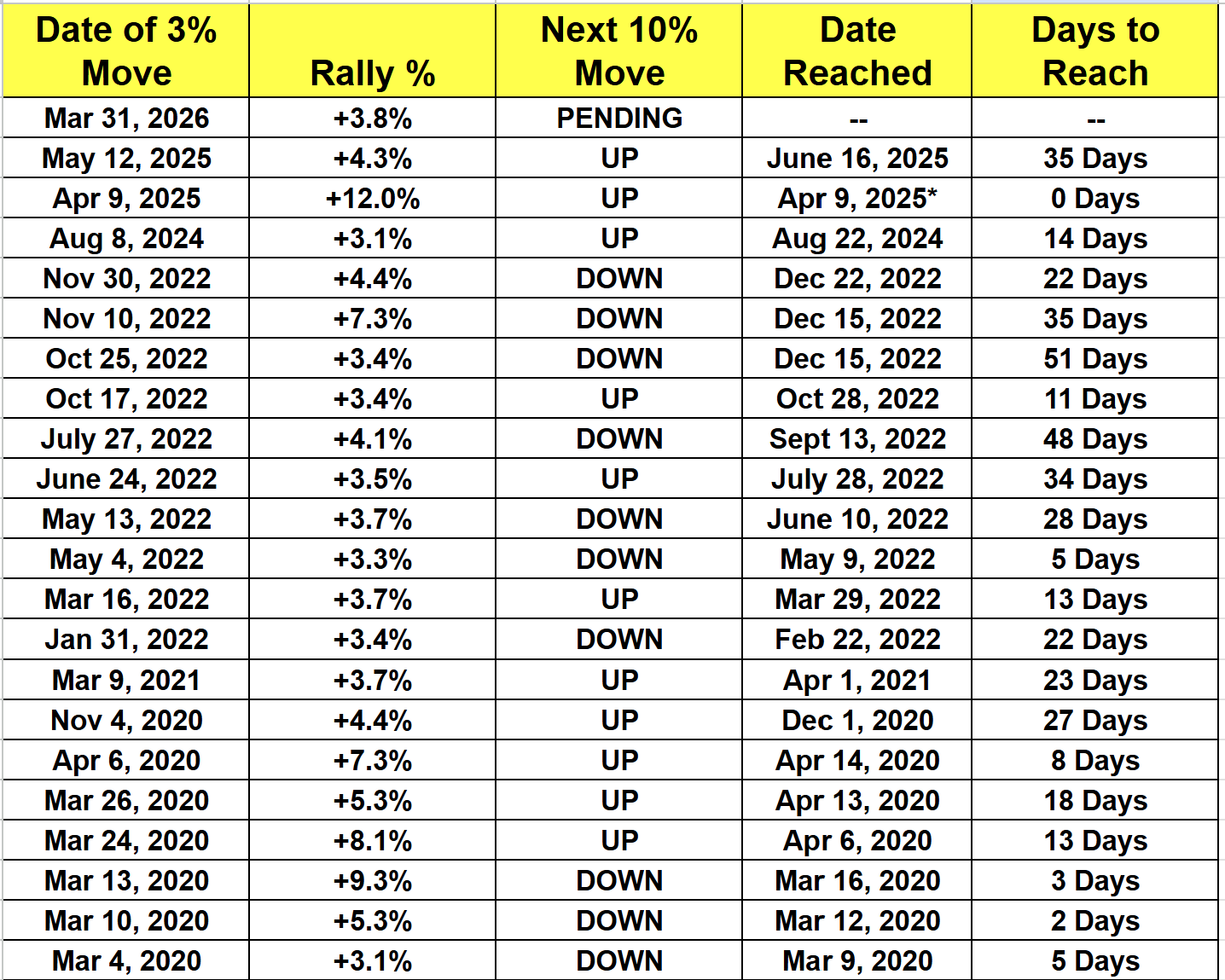 The table shows every 3% single up day in QQQ since 2020, including Tuesday’s. I then figured out what the next 10% move in QQQ was following that one-day blast off. And how long it took to get there.