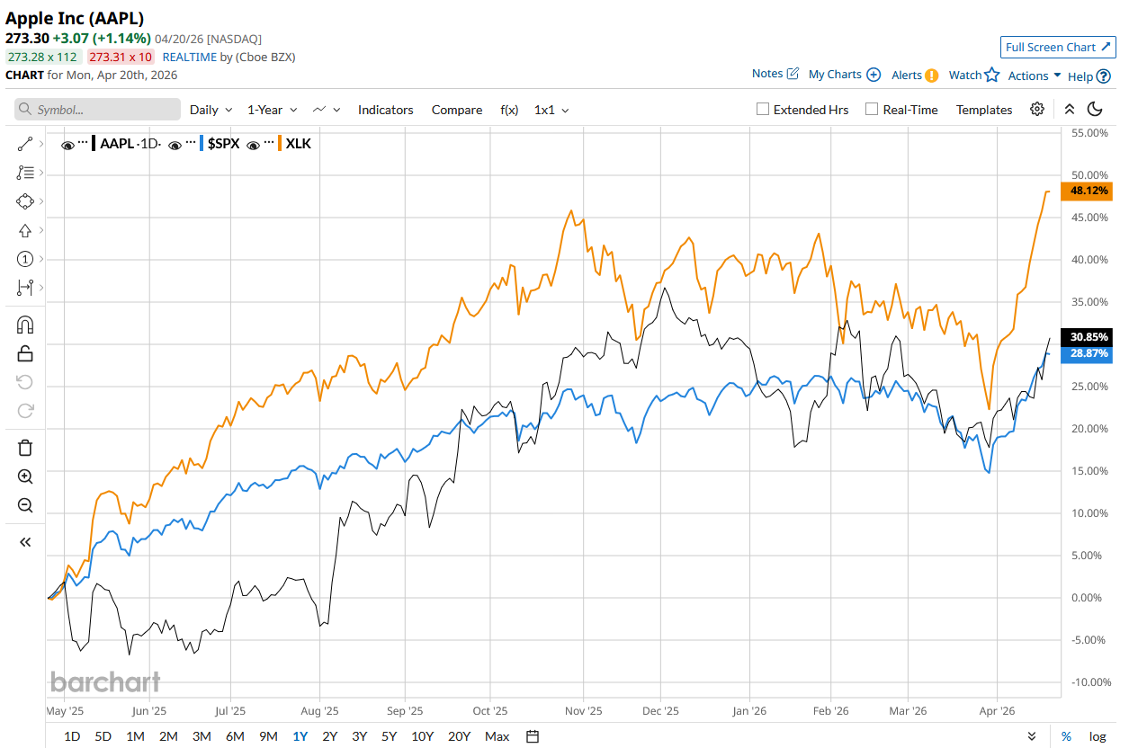 AAPL stock has surged 38.8% over the past 52 weeks, outperforming the S&P 500 Index’s ($SPX) 34.7% rise but lagging behind the State Street Technology Select Sector SPDR ETF’s (XLK) 60.2% rise during the same time frame.