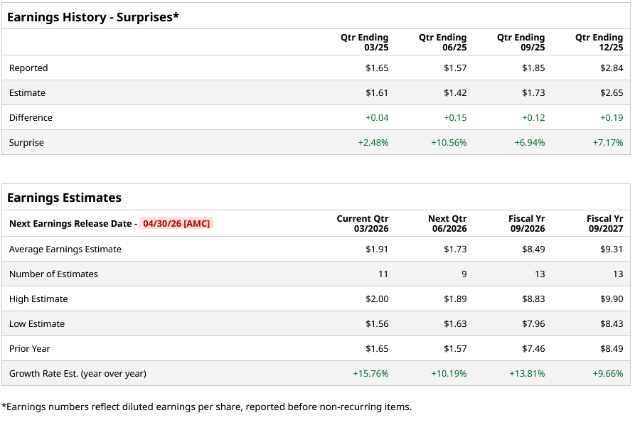 For fiscal 2026, analysts project the company’s EPS to be $8.49, up 13.8% from $7.46 in fiscal 2025. Moreover, its EPS is expected to rise by roughly 9.7% year over year (YoY) to $9.31 in fiscal 2027.