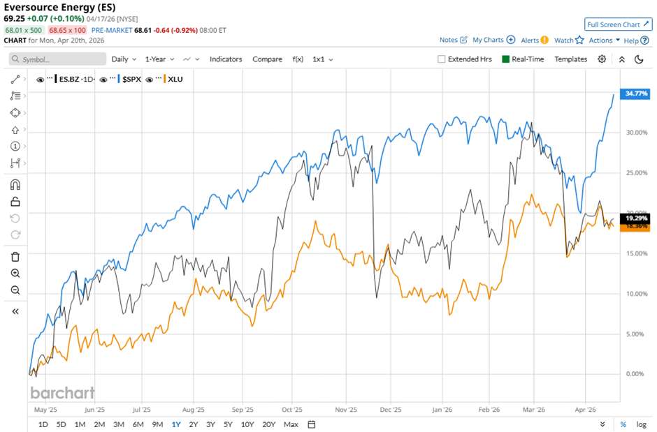 ES stock has risen 19.5% over the past 52 weeks, underperforming both the S&P 500 Index's ($SPX) 34.9% gain. However, the stock has slightly outpaced the State Street Utilities Select Sector SPDR ETF's (XLU) 18.6% increase over the same period.