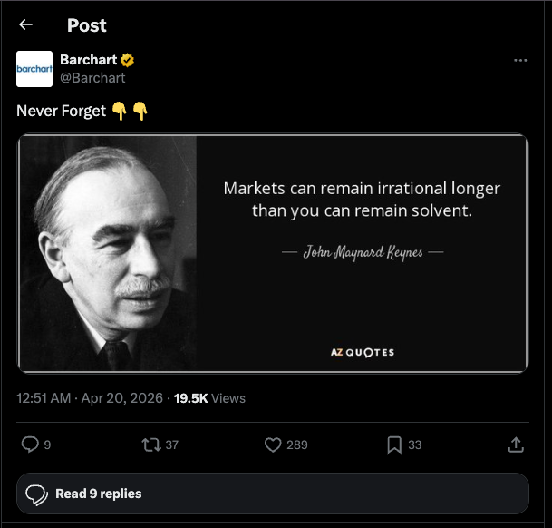 My plan was to put this piece together over the past weekend, but I knew how the time from last Friday’s close through Monday morning’s open in US markets was going to go. Recall the euphoria in global stocks as last week came to an end, with the S&P 500 ($INX) and Nasdaq ($NASX) going to new all-time highs on the weekly social media post from the US president to do just that – rally US stock markets into the weekend. This one proclaimed the Strait of Hormuz (aka Strait of ‘Vermouth’ according to US Treasury Secretary Bessent) was “COMPLETELY OPEN AND READY FOR BUSINESS” (emphasis the US president’s, reportedly, not mine). As I’ve said many times over the past 10 years, a rational human being would realize there was just another not necessarily the Truth Social media post. But algorithms aren’t rational human beings, oddly fitting with what John Maynard Keyes said about many decades ago, “Markets can remain irrational longer than you can remain solvent”.
