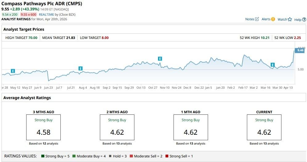 The consensus rating on Compass Pathways is set at a “Strong Buy” currently, with the mean target of nearly $22 indicating potential upside of another 145% from here.