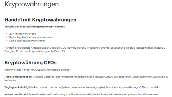 VestoFX.net bietet CFDs auf eine breite Palette von Vermögenswerten, einschließlich Kryptowährungen, Währungen, Aktien, Indizes und Rohstoffen. Die Plattform ermöglicht es Händlern, auf Preisbewegungen in einer hochflexiblen Handelsumgebung zu spekulieren. VestoFX.net wird von Fairmont Financial Services (PTY) LTD betrieben, einer südafrikanischen Investmentgesellschaft, die von der Financial Sector Conduct Authority (FSCA) von Südafrika autorisiert und reguliert wird und die Finanzdienstleisterlizenznummer (FSP) 51766 besitzt.